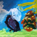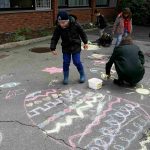 Gøy var det også for barna i skolealder. De tilnærmet seg påskemysteriet ved form og farge i fellesskap med sr. Dana Benedicta. De åpnet med å male innendørs, før noen av barne gikk ut og dekorerte søstrenes gårdsplass. De hadde Palmesøndag for øyet, noe som resulterte i et fargesprakende kunstverk med Kristus ridende på et esel inn mot Jerusalem i sentrum, omkranset av mennesker med palmegrener, så vel som påskeharer, kyllinger og egg.