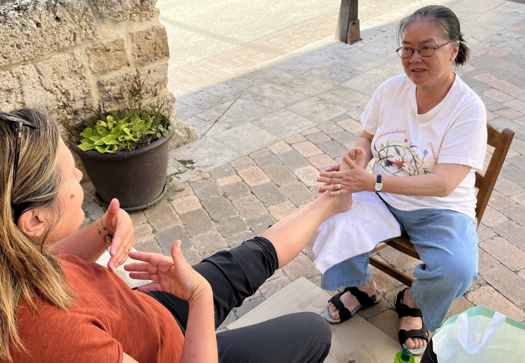 Søstrene tilbyr nemlig enkel pleie av fotskader og lett fotmassasje, mens de hele tiden har et lyttende øre. Ofte kommer tårene frem, men også smilet. For hjertet føles lettere for den som kommer langveisfra og som møter et lyttende øre i en avsides liten landsby i Spania.