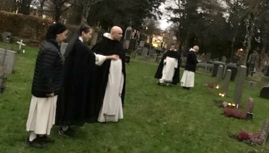 Vel fremme på gravlunden ble det satt ned lys og bedt for de brødre, søstre og nonner som har gått forut for de som er i klostrene i dag.