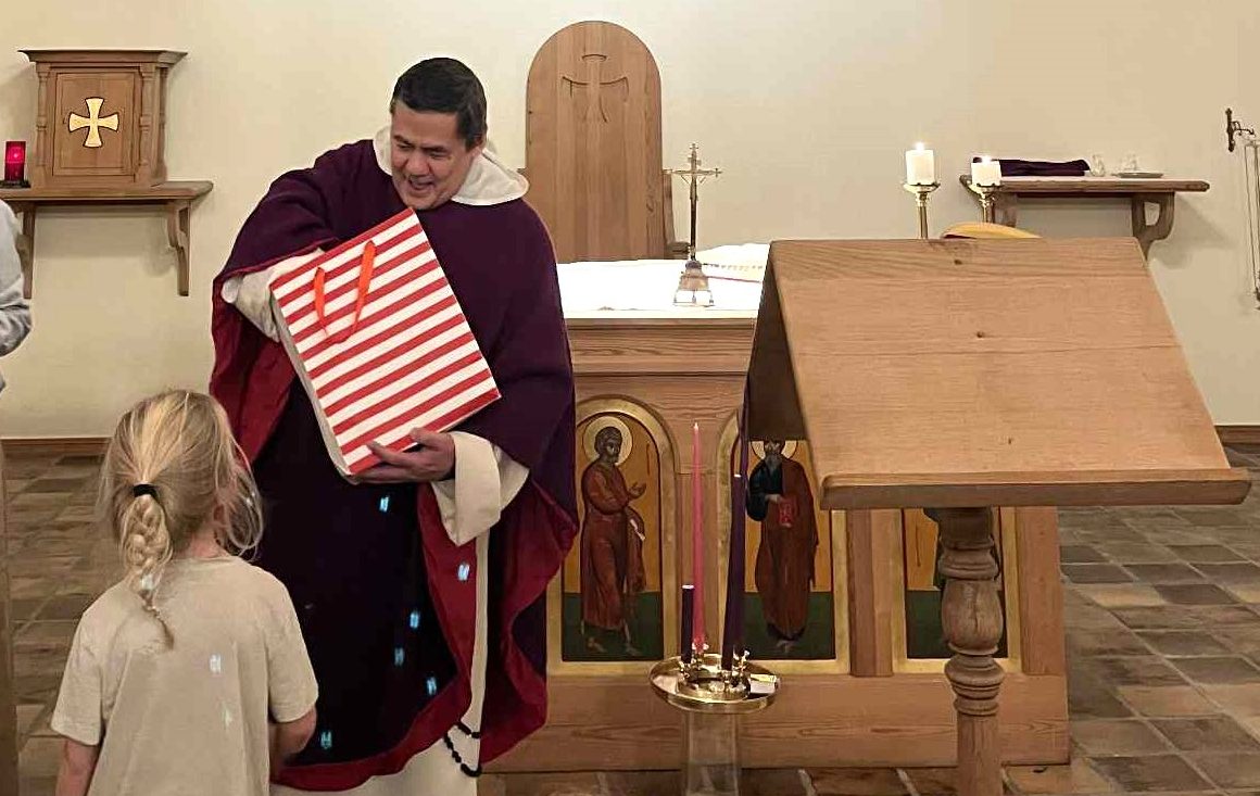 Så, det ble en velkommen overraskelse da pater Paul Dominique etter avslutningsordene, inntok en ny rolle. Han ble selveste St. Nikolas. Med gaver til alle.