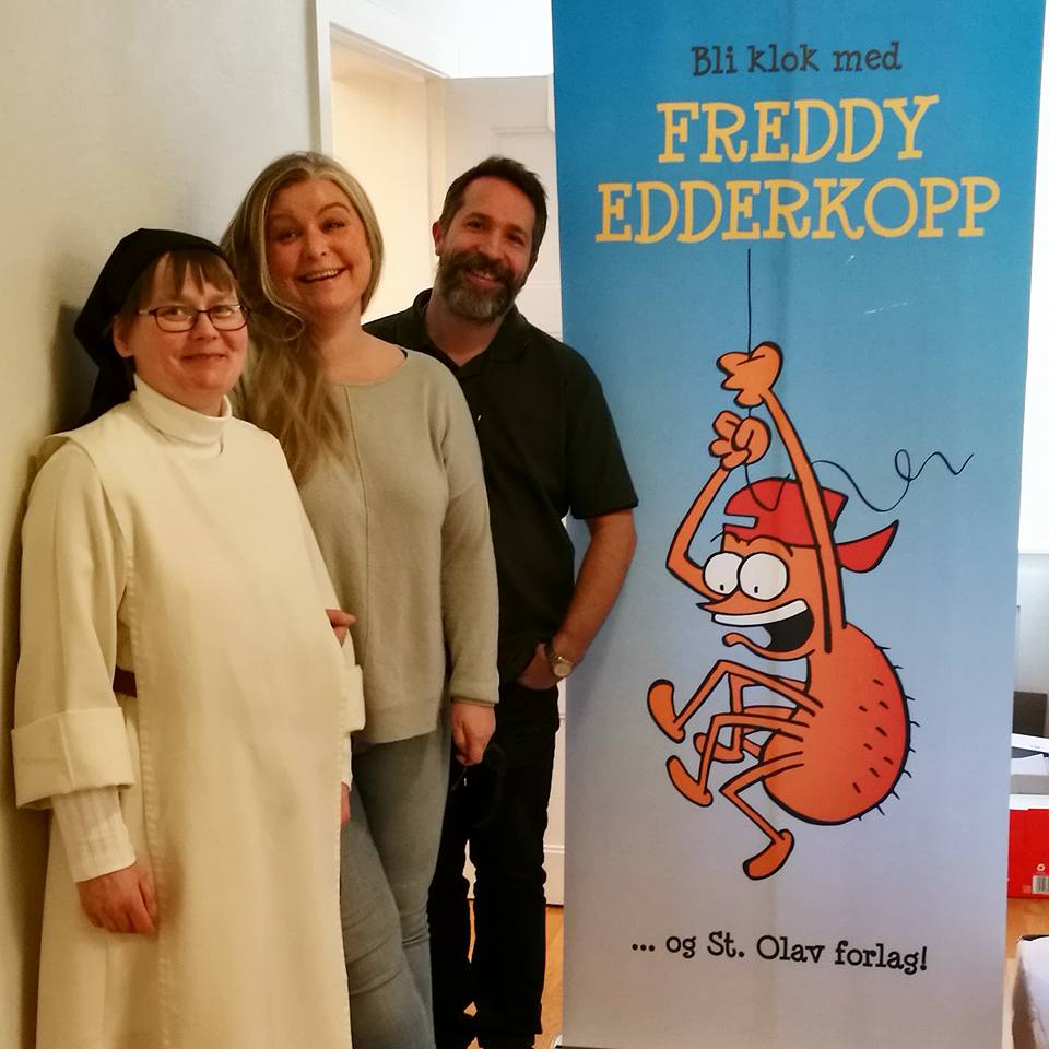 I år har vi også en barnebok-lansering kl. 12.00. Det er boken Freddy edderkopp og helgenskaren som slippes. Dette er tredje bok i bokserien om edderkoppen Freddy, forfattet av sr. Ane-Elisabet Røer og illustrert av Roy Søbstad.